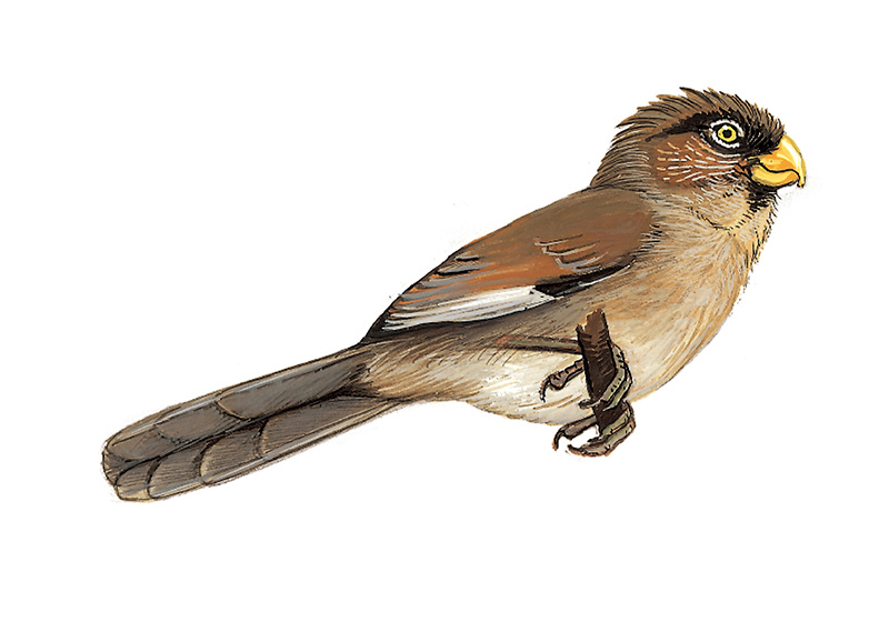 描述:体型略大(23厘米)的橄榄灰色鸦雀。冠羽蓬松,白色眼圈明显,颏、眼先及宽眉纹深褐色。初级飞羽羽缘近白,拢翼时成浅色斑块。