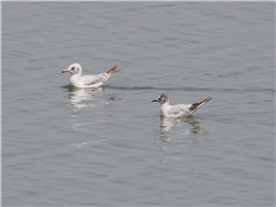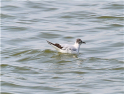 描述:体小(26厘米)的鸥。头及嘴黑色,腿红色。头部黑色后延比红嘴鸥长。飞行时整个翼下色深并具狭窄的白色后缘。冬羽头白,顶、眼周及耳覆羽的月牙形斑均灰,尾略凹。第一冬的鸟飞行时具黑色的"W"型图纹,尾端黑色,与第一冬楔尾鸥的区别在尾的形状,且头顶色较暗。