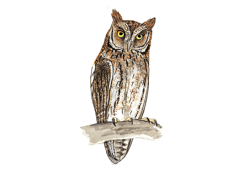 描述:体小(22厘米)的棕褐色角鸮。眼黄色,体羽上白色点斑杂乱。头顶无深黑色条纹而有别于红角鸮,但最好以叫声区分。与领角鸮的区别在眼黄色且无领圈;与Spotted Scops Owl 鸮的区别在嘴色深。