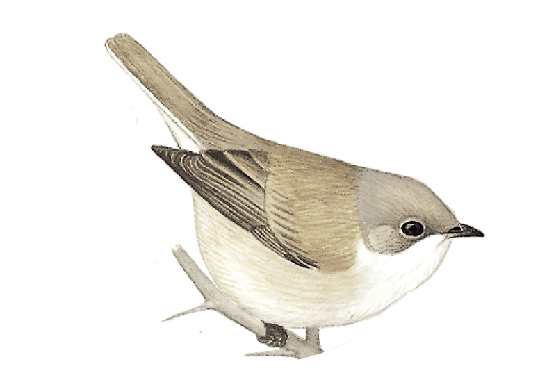 描述:体型略小(13厘米)的纯色林莺。上体清沙灰色,喉及下体白,尾缘白色。与白喉林莺的区别在体羽灰色较淡,无近黑色的耳羽且嘴较小。与漠地林莺的区别在体羽灰色而非棕褐色,且尾上覆羽灰色。